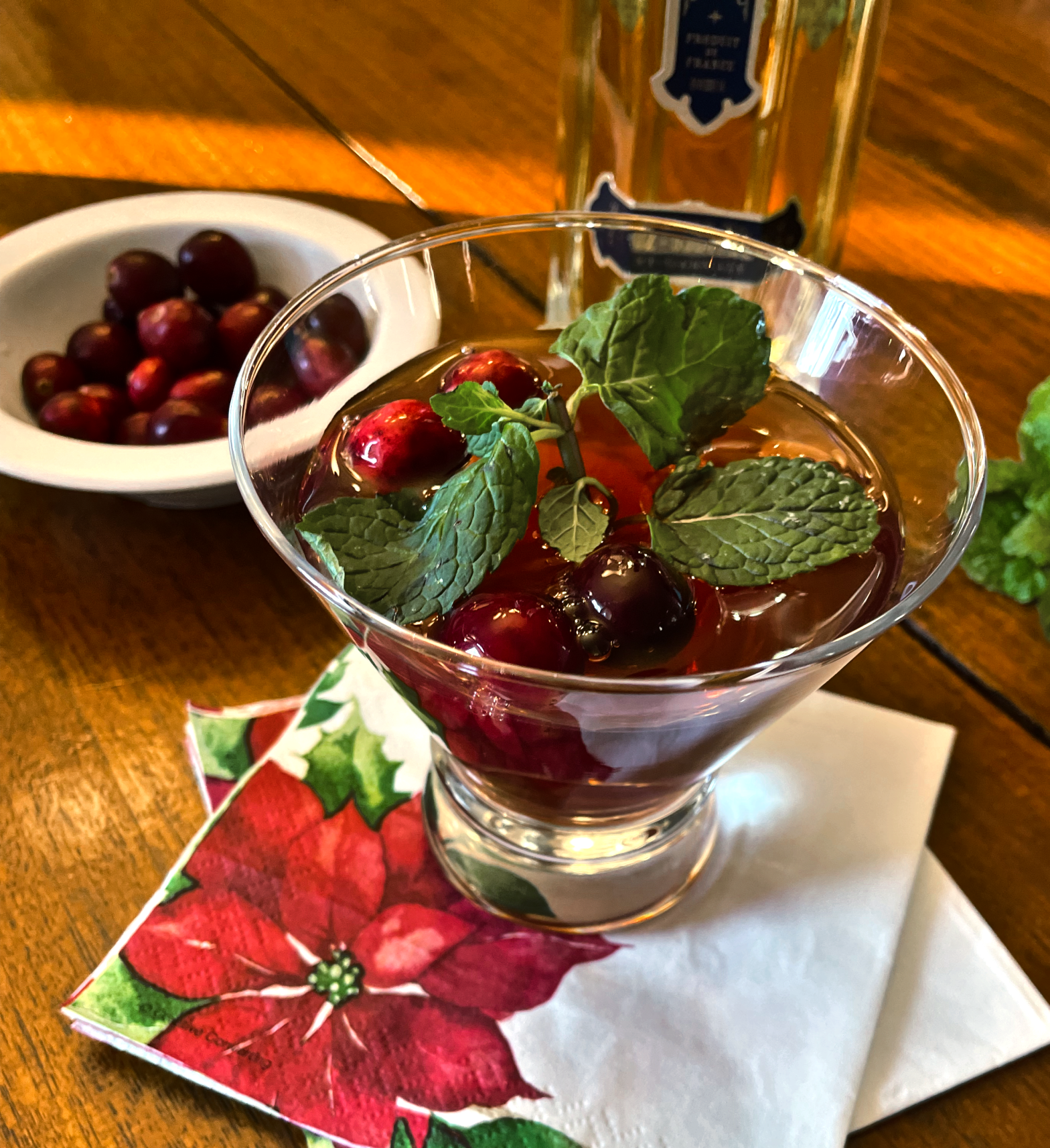 You can find about a hundred different renditions of this drink online but this is by far my favorite variation. It calls for vodka, St. Germain, cranberry pomegranate juice and pops with color and texture with a garnish of fresh cranberry & mint!